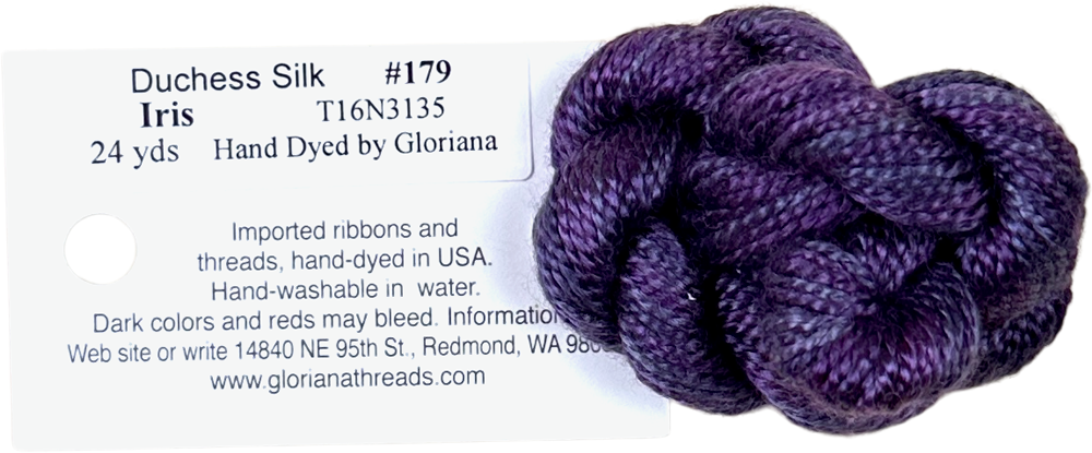 This is Duchess Silk from Gloriana in color 179 Iris. A soft variegated silk that is perfect for 13 mesh! 1 ply on 13 mesh.