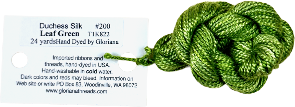 This is Duchess Silk from Gloriana in color 200 Leaf Green. A soft variegated silk that is perfect for 13 mesh! 1 ply on 13 mesh.