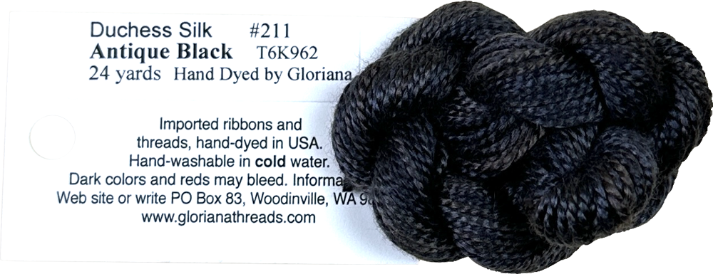 This is Duchess Silk from Gloriana in color 211 Antique Black. A soft variegated silk that is perfect for 13 mesh! 1 ply on 13 mesh.