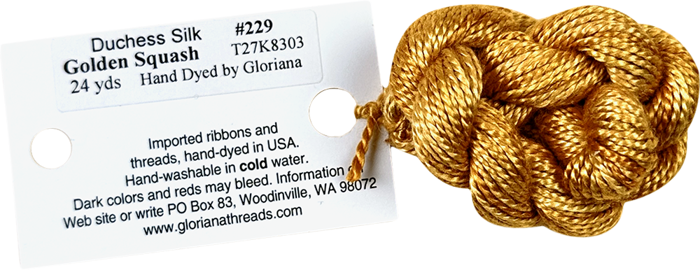 This is Duchess Silk from Gloriana in color 229 Golden Squash. A soft variegated silk that is perfect for 13 mesh! 1 ply on 13 mesh.