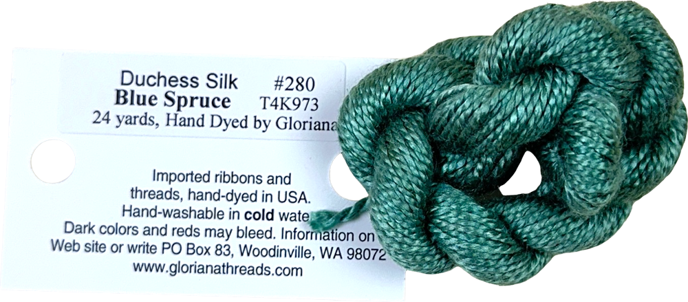 This is Duchess Silk from Gloriana in color 280 Blue Spruce. A soft variegated silk that is perfect for 13 mesh! 1 ply on 13 mesh.