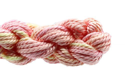 This is Princess Perle from Gloriana in color 038 Rosa Linda. A lush perled silk thread in a range of variegated colors.1 ply on 18 mesh.