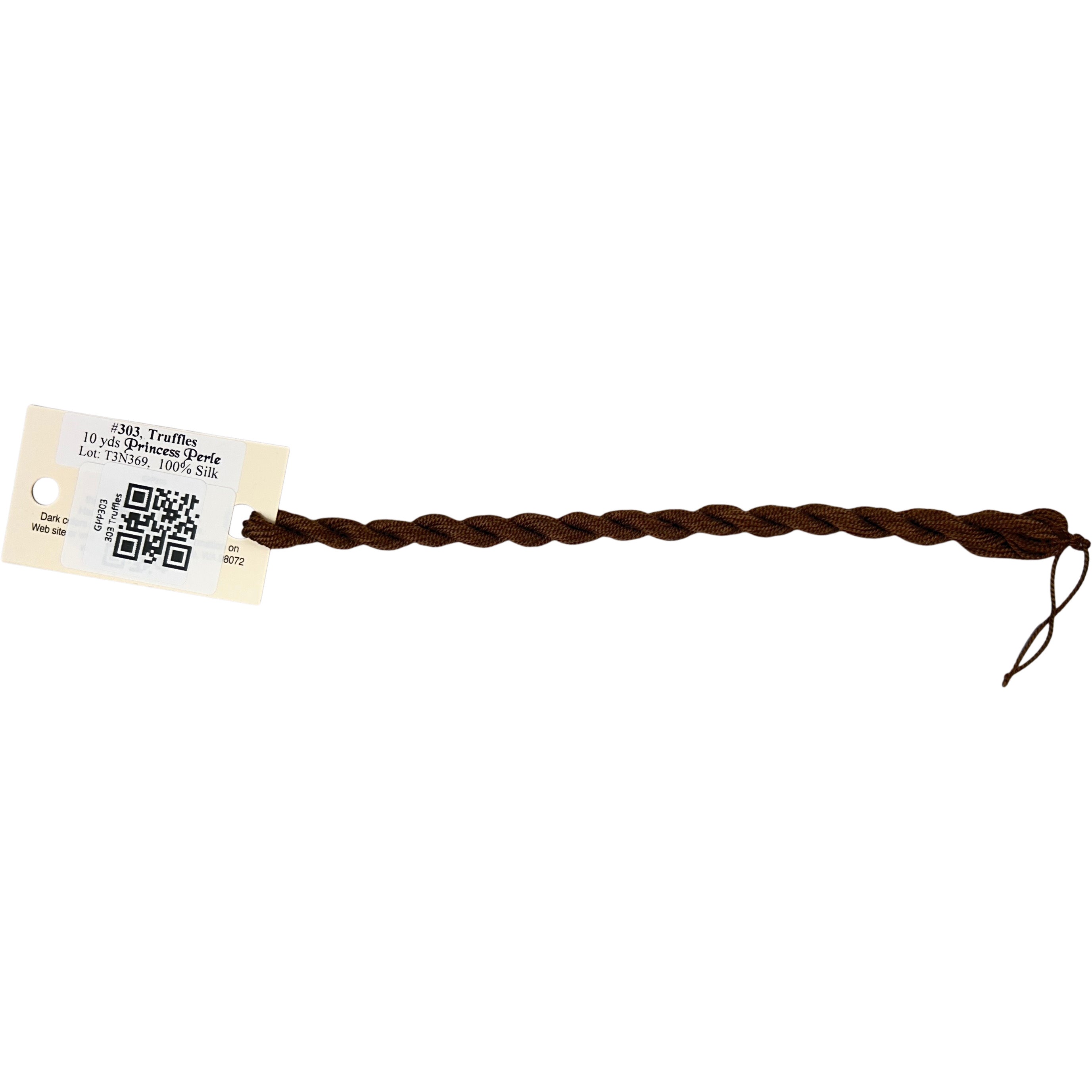 This is Princess Perle from Gloriana in color 303 Truffles. A lush perled silk thread in a range of variegated colors.1 ply on 18 mesh.