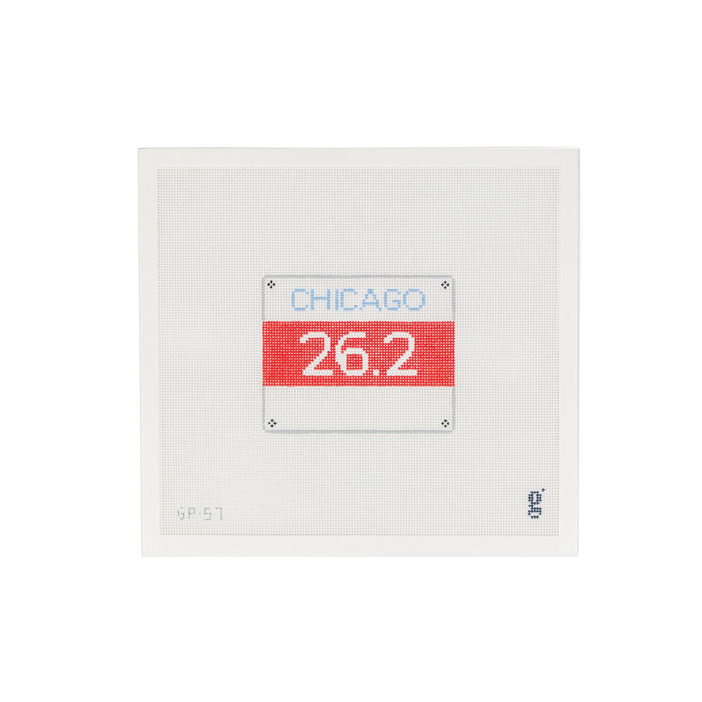 This hand painted needlepoint canvas from Goodpoint Needlepoint features a race bib for a race in Chicago.