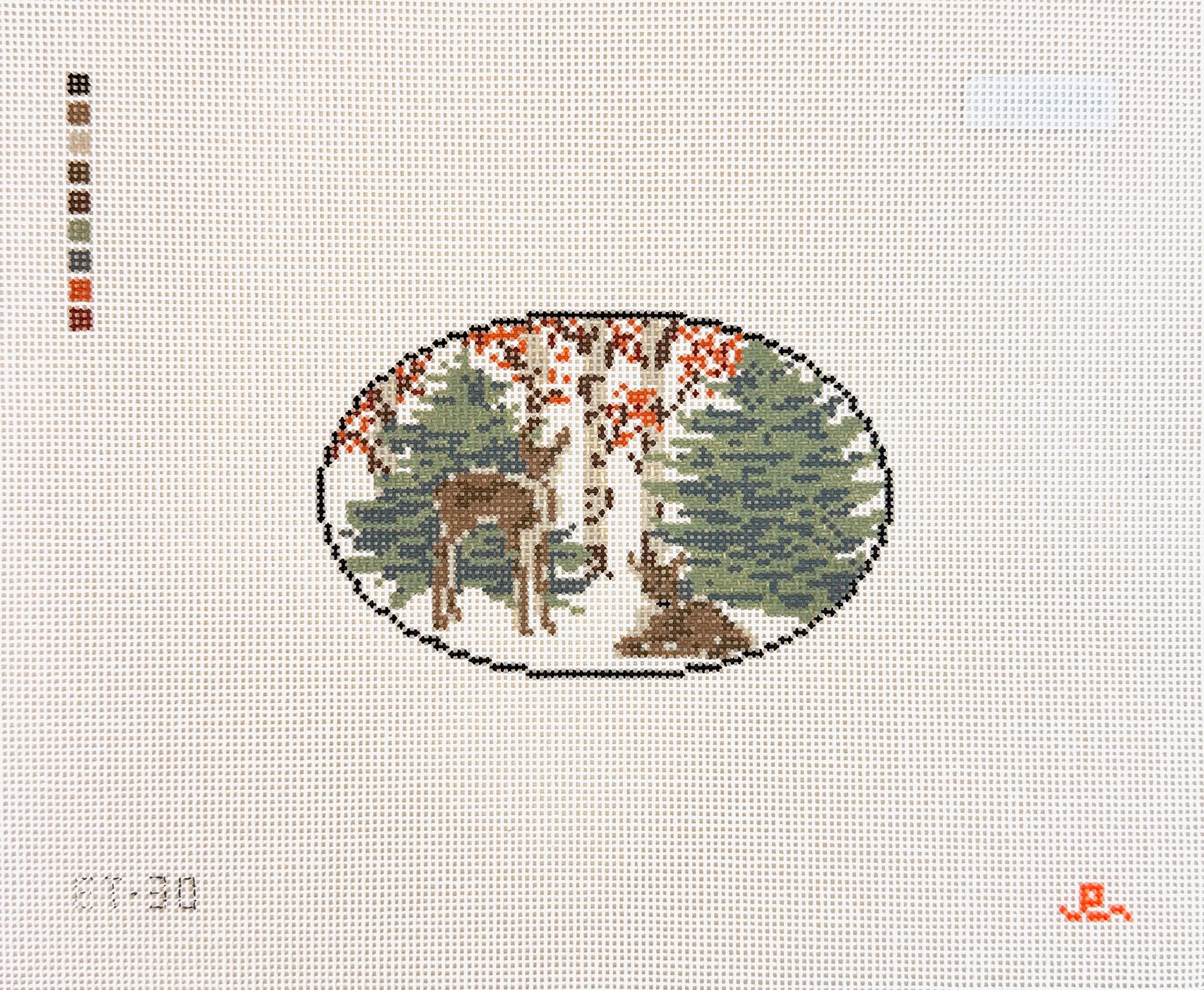 This is a hand-painted needlepoint canvas by Elizabeth Taylor from Goodpoint Needlepoint. It features a beautiful scene with some fawn in the woods within an oval shape.