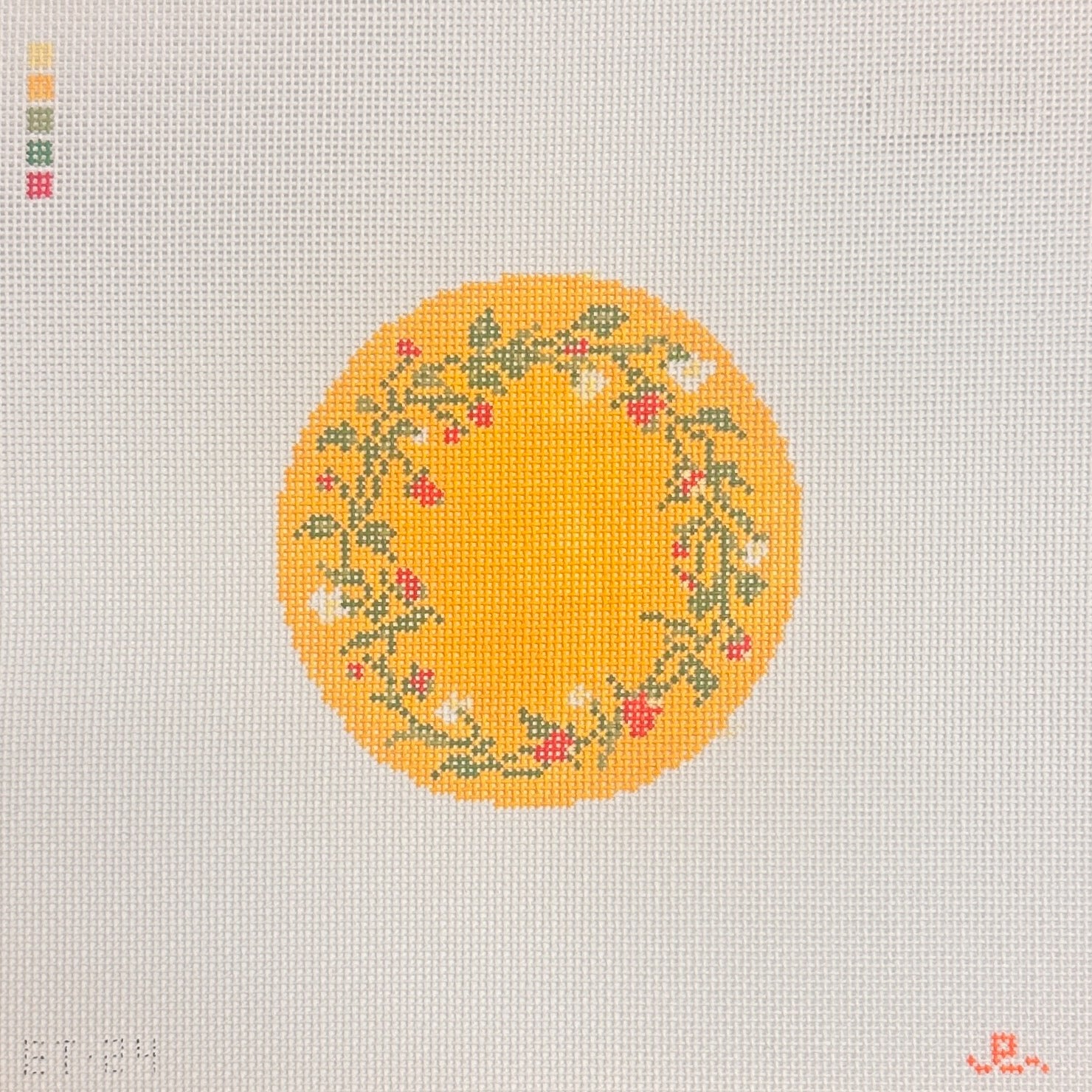 This is a hand painted needlepoint canvas by Elizabeth Taylor from Goodpoint Needlepoint. It features a round design with some summer foliage within.