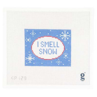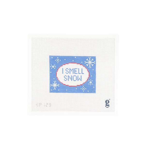 This is a hand painted needlepoint canvas from Goodpoint Needlepoint. It features the phrase "I Smell Snow" within an oval with a red outline, against a blue, snowflake-spotted background.
