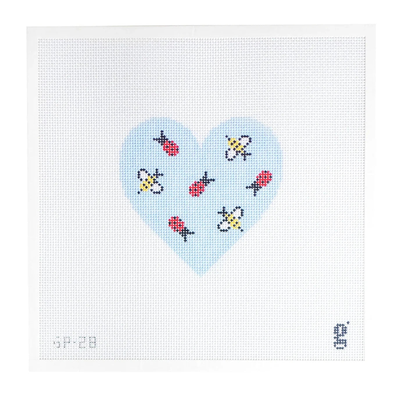 This hand painted needlepoint canvas from Goodpoint Needlepoint features a blue heart with bees and lady bugs.
