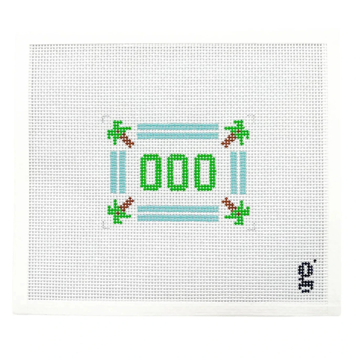 This is a hand painted needlepoint canvas from Goodpoint Needlepoint. It features the abbreviation "OOO", short for "Out of Office", surrounded by a blue border with palm trees at the corners.