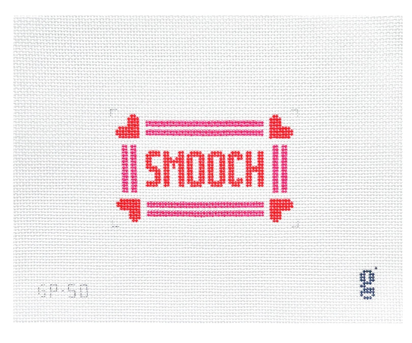 This hand painted needlepoint canvas from Goodpoint Needlepoint features the word "Smooch" with heart accents.