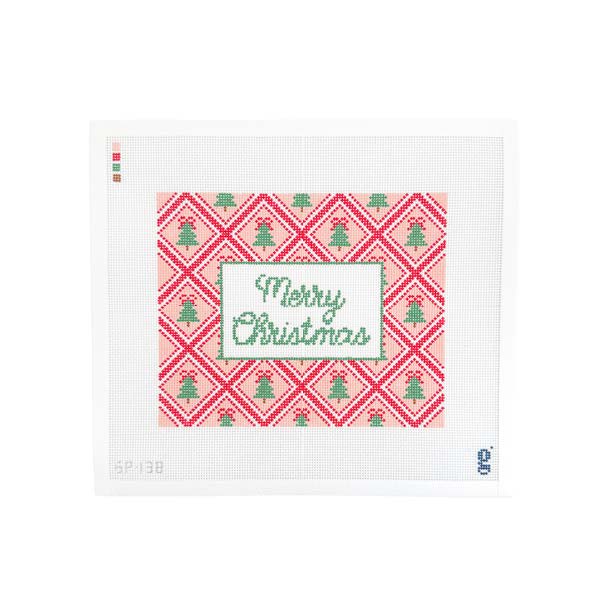 This is a hand painted needlepoint canvas from Goodpoint Needlepoint. It features the festive text "Merry Christmas" in green script, surrounded by a pattern of Christmas trees.
