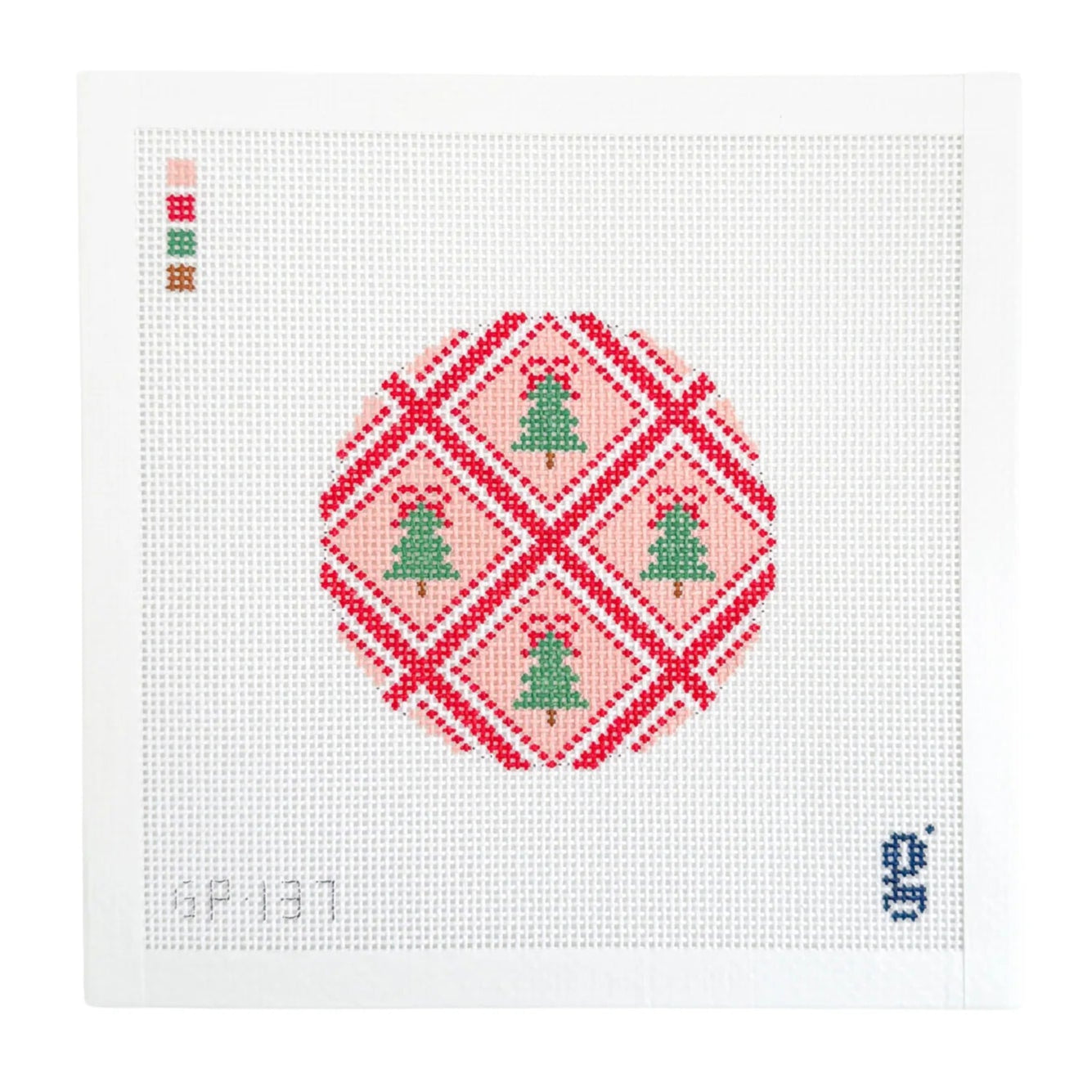 This is a hand painted needlepoint canvas by Goodpoint Needlepoint features Christmas trees in a pink and red trellis design.