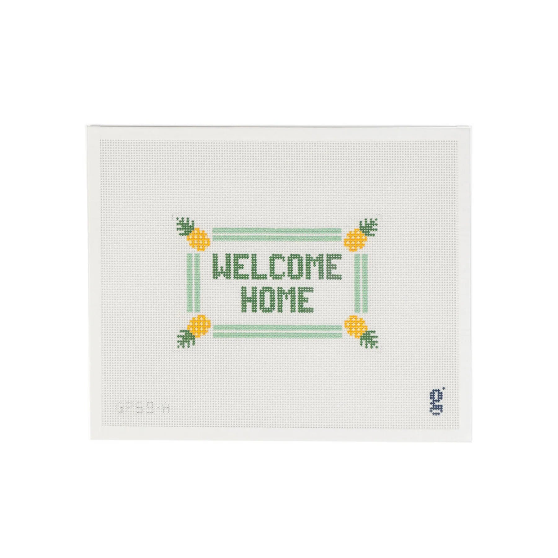 This is a hand painted needlepoint canvas by Goodpoint Needlepoint features "Welcome Home" in a green frame with pineapple corners.