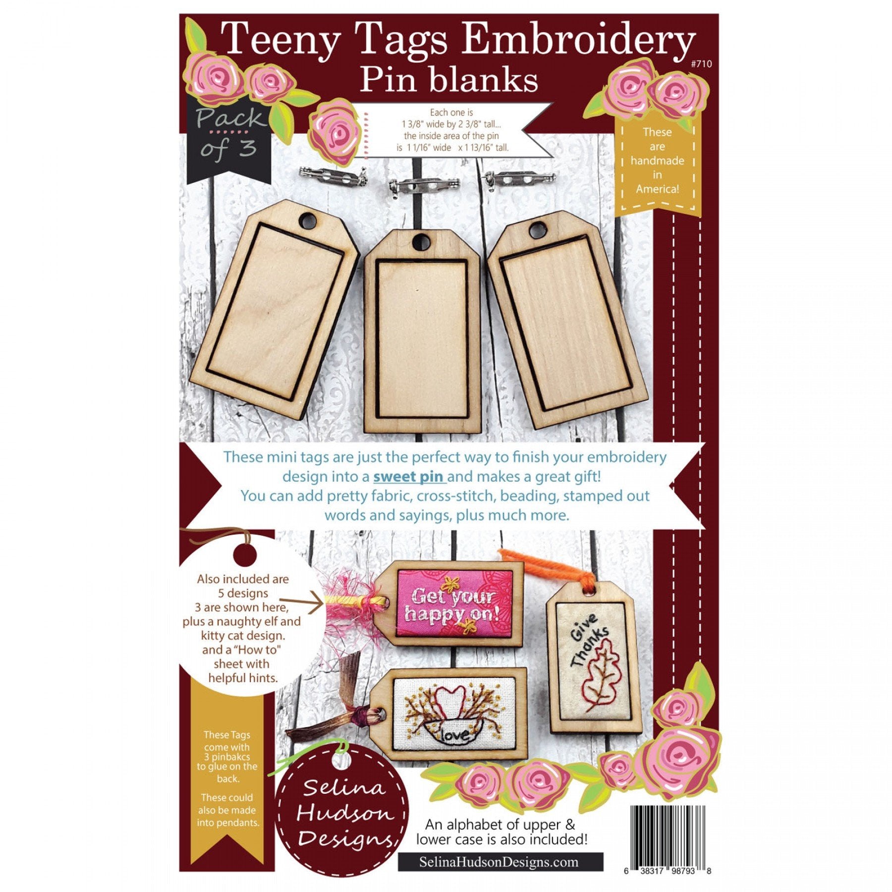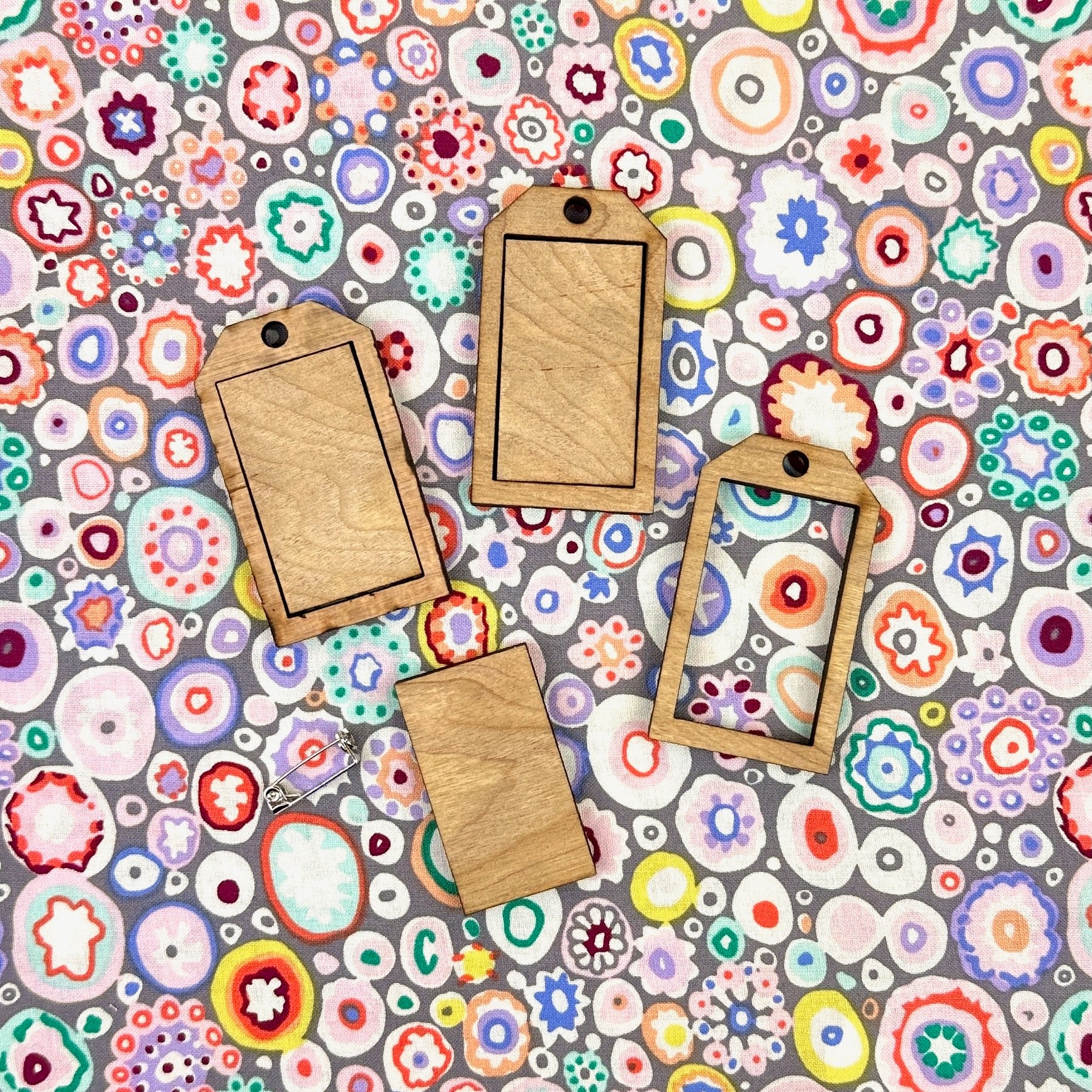 These Teeny Tag-shaped mini hoops are a great way to create pendants from your needlework! You can create little masterpieces in cross stitch, embroidery, or needlepoint then wrap them around the base disc and put the frame over it. It is recommended to use a piece of felt and some adhesive to cover the back and secure everything in place. For needlepoint, 13M is a snug fit and may require a bit of sanding to fit well, but 18M fits without sanding. Hang your pendant on a chain or ribbon and you have lovely piece to wear or gift. They also come with pin backs that you can attach with adhesive to make them into a brooch. Note that there may be some darkening on the back of the frame from the laser cutting process.
