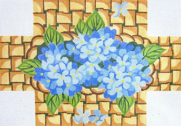 A beautiful hand painted needlepoint canvas from Silver Needle. Lovely blue hydrangeas in basket brick doorstop needlepoint canvas.