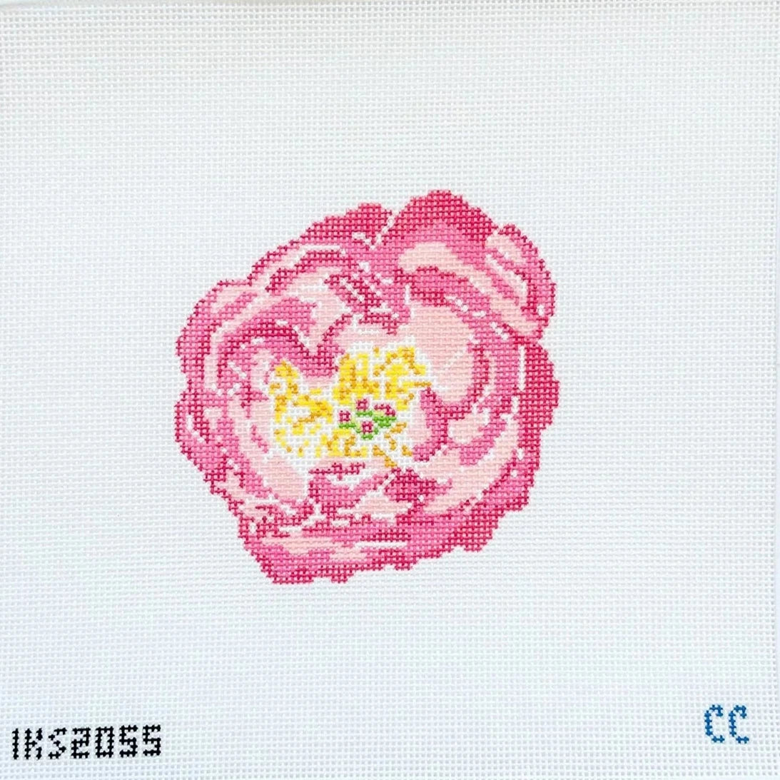 This is a hand painted needlepoint canvas by Catherine Cartie Calligraphy for Initial K Studio. It features a detailed pink peony with a yellow center.