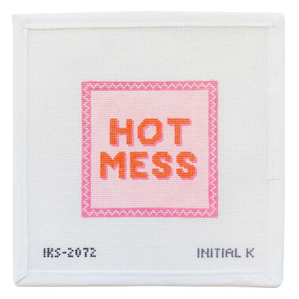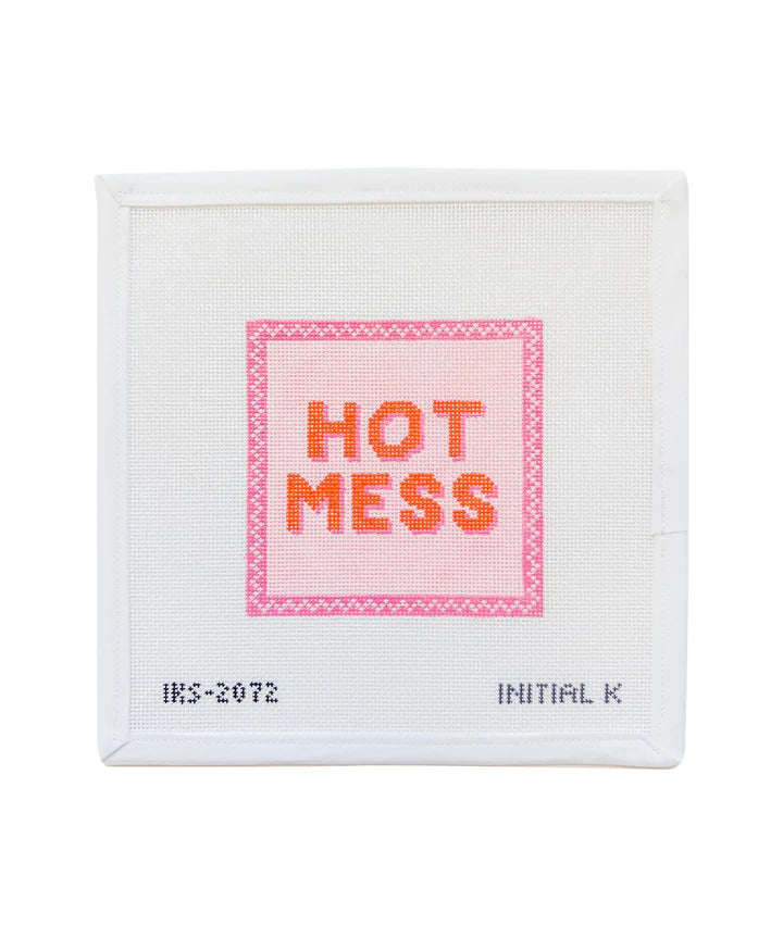 This hand painted needlepoint canvas by Initial K Studio features Hot Mess in pink and orange in a 4 x 4 size perfect to finish as a coaster.