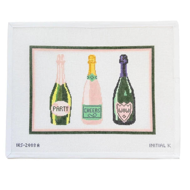 This hand painted needlepoint canvas by Jacinda Boneau for Initial K Studio features a trio of champagne bottles with a labels that says Party, Cheers, Wow.