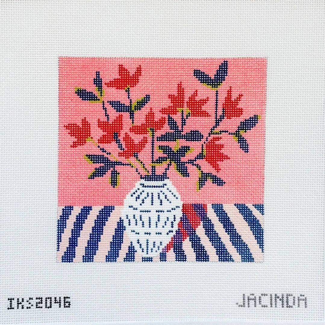 This is a hand painted needlepoint canvas by Jacinda Boneau for Initial K Studio. It features a blue and white vase with red flowers on a striped table cloth against a coral background.