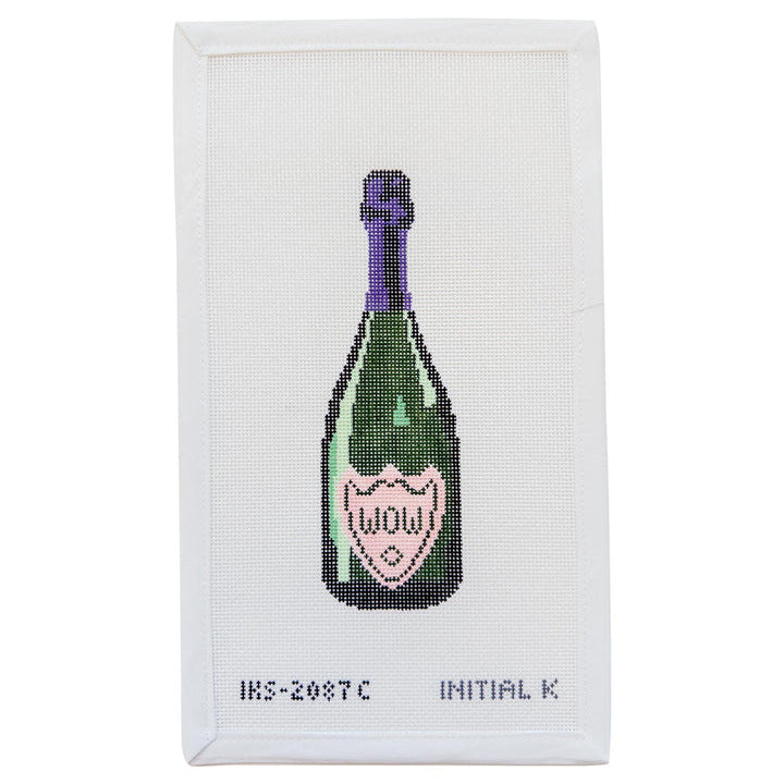 This hand painted needlepoint canvas by Jacinda Boneau for Initial K Studio features a dark green champagne bottle with a label that says "Wow".
