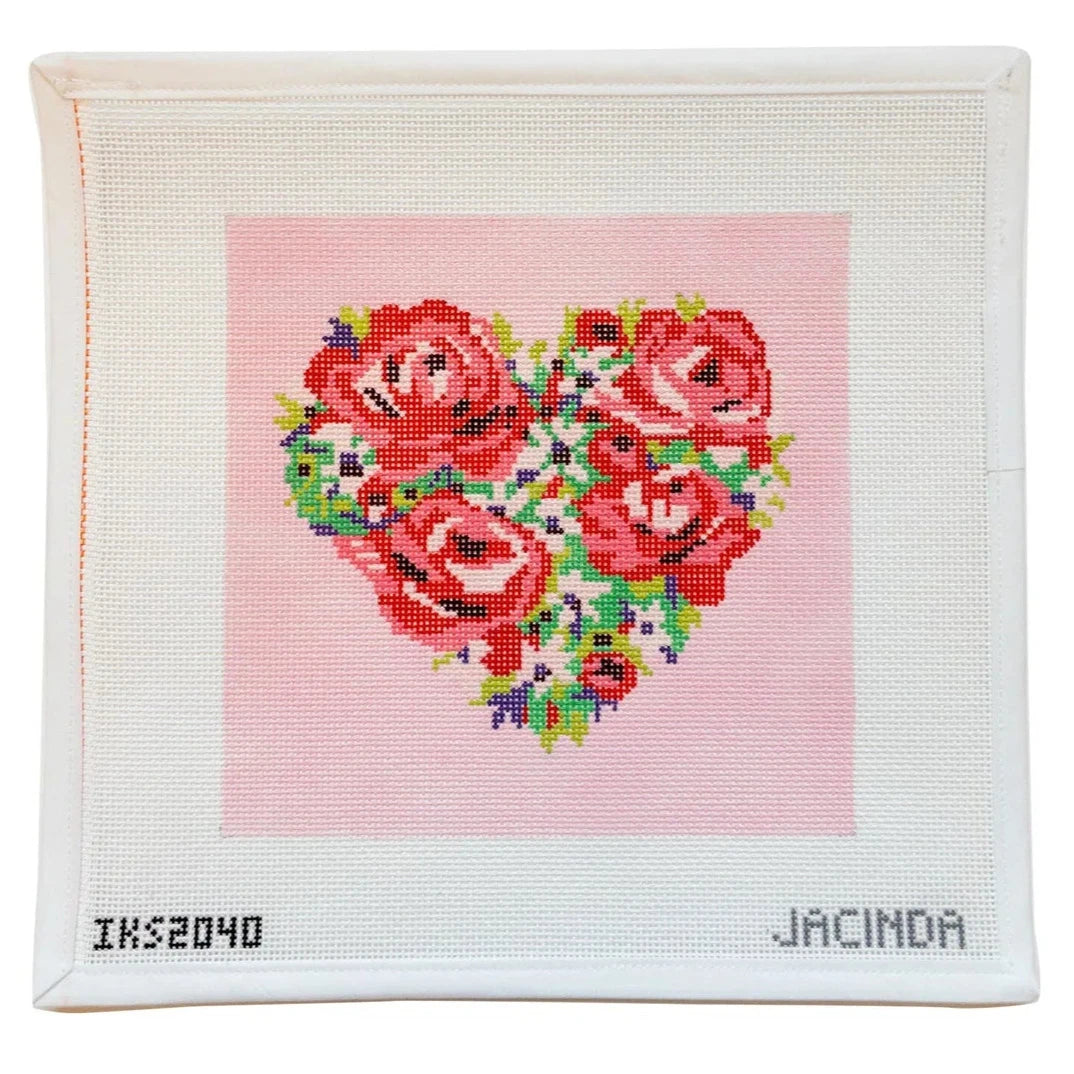 This hand painted needlepoint canvas by Initial K Studio features a lovely heart bursting with roses and other flowers.