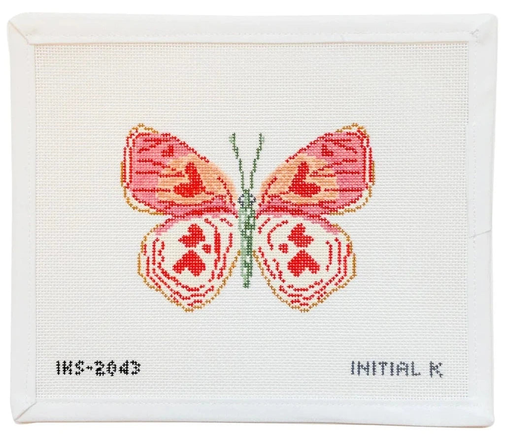 This hand painted needlepoint canvas by Initial K Studio features a pretty butterfly with hearts on its wings.