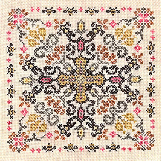This is a printed cross stitch pattern by Ink Circles. It features beautiful floral geometric designs in a softly muted color palette. As stitched, the example uses The Gentle Art Sampler Threads cotton floss on 36 count linen, in the color Inca by Fox and Rabbit. A DMC color conversion chart is also included.