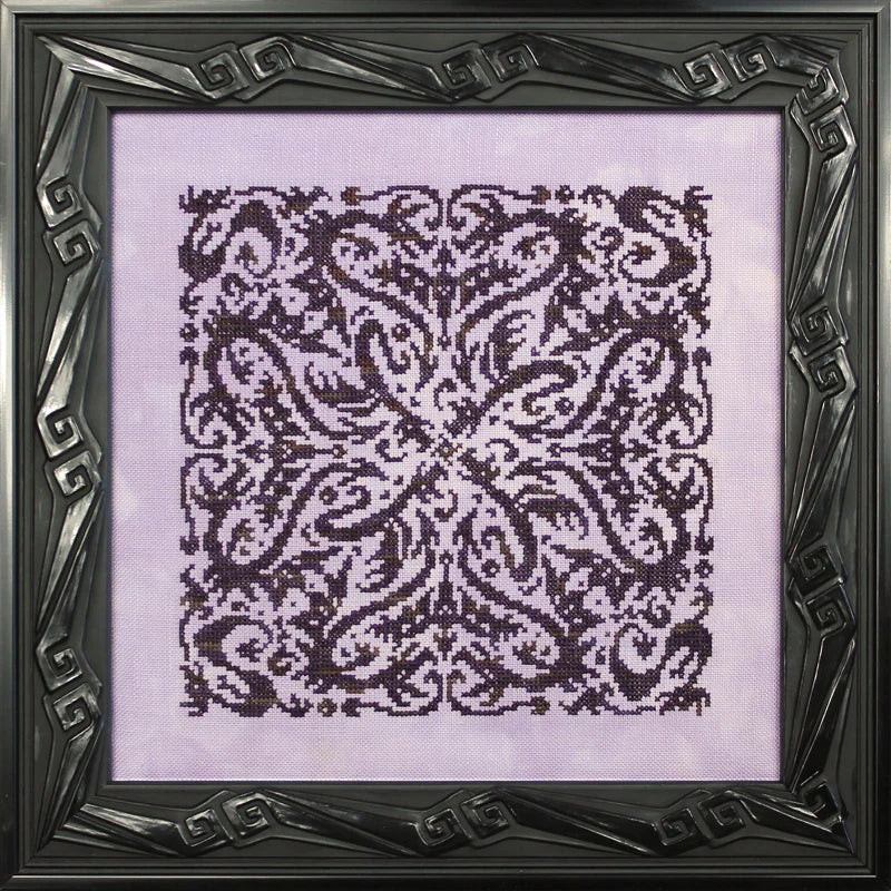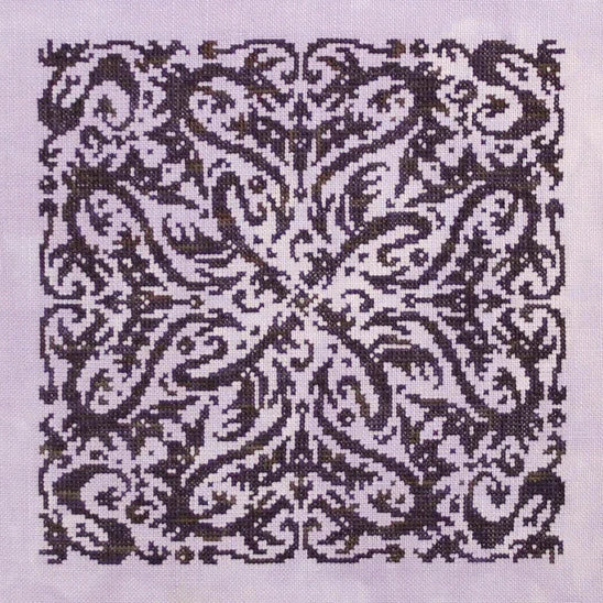 Third in the Elemental Dragons series. This one is stitched in Gloriana's Thistle Purple silk floss (3 skeins needed) on Mystic Fabric's 32 count Spring Breeze linen.