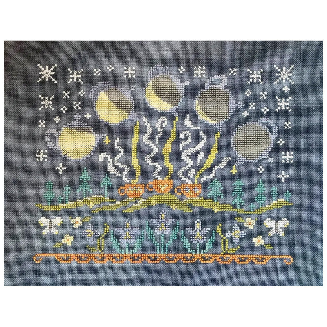 This is a printed cross stitch pattern by Ink Circles. It features the stages of the moon as teapots emptying into teacups as the moon transitions. The quaint night scene also includes flowers and butterflies under a star-studded sky. As stitched, the example uses Classic Colorworks cotton floss on 32 count linen, in the color Night Sky by Fiber on a Whim. A DMC color conversion chart is also included.