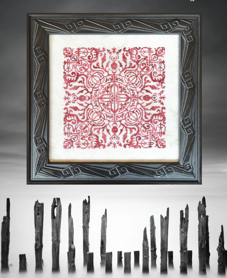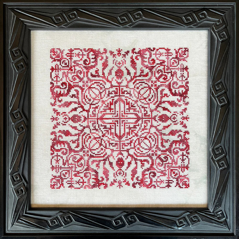 This cross stitch pattern from Ink Circles features a sigil that represents strength. This is one of four new cross stitched sigils created to help manifest good things this year. This was stitched with Silk 'N Colors Frosted Auburn silk.
