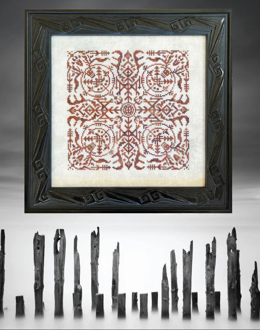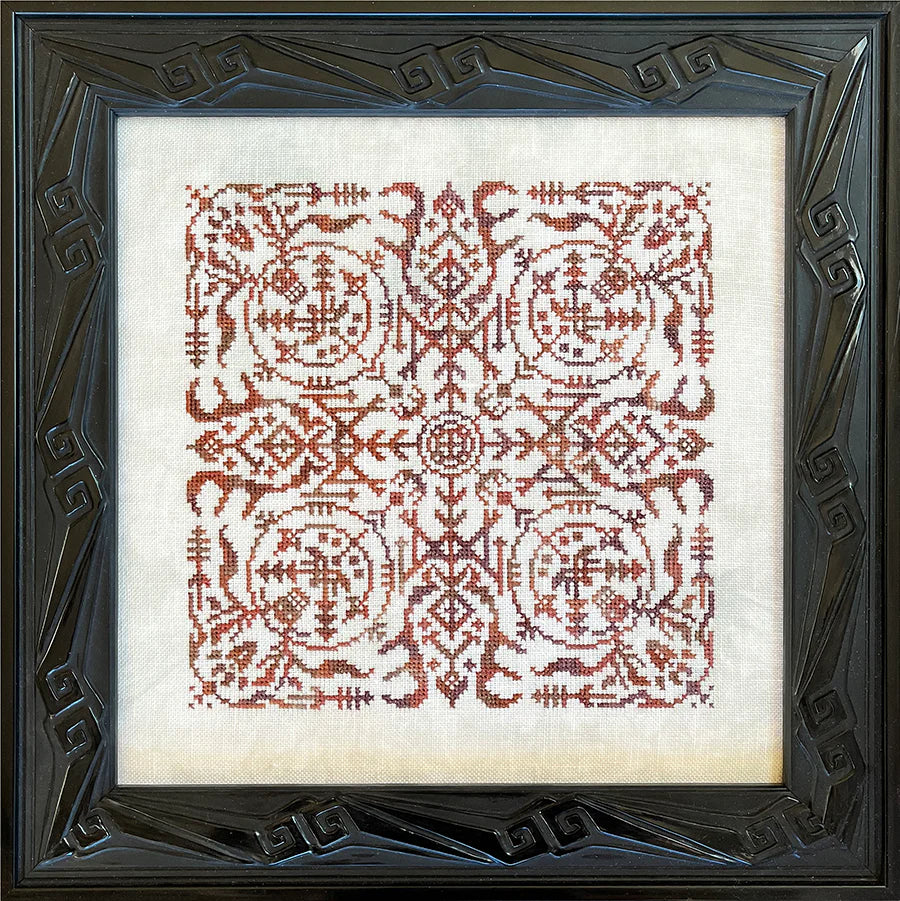 This is a printed cross stitch pattern by Ink Circles from the New Alchemy series. It features a sigil that represents Wisdom. As stitched it uses Silk 'n Colors.