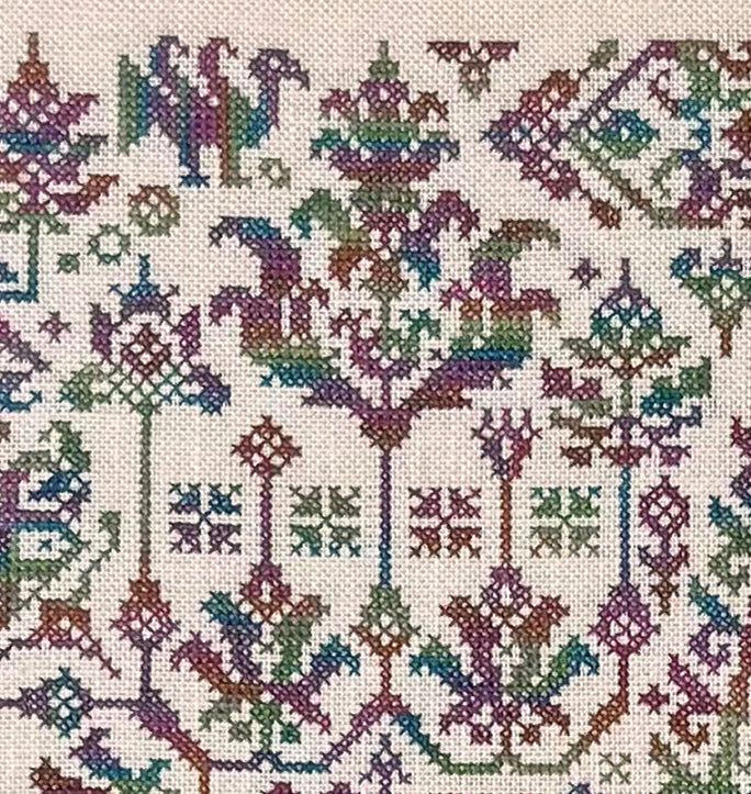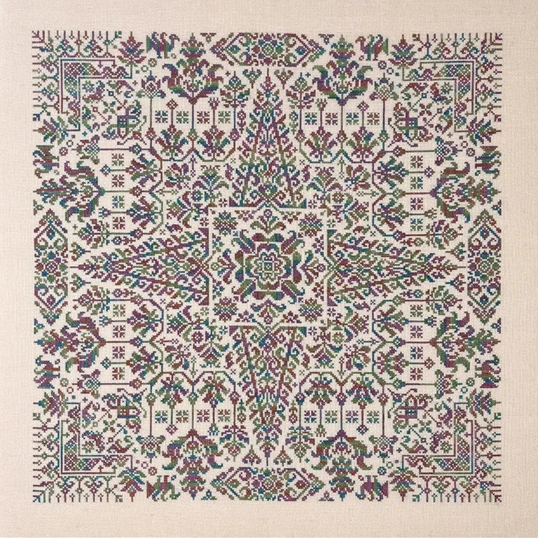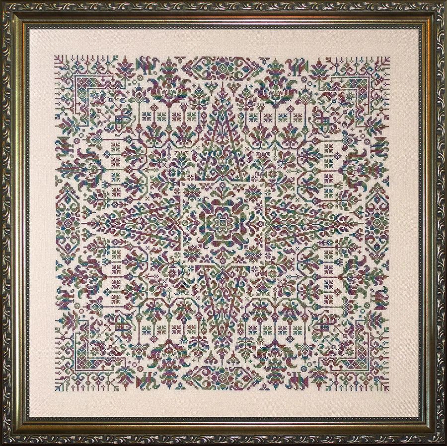 Once again tapping into the rich collection of antique motifs from Indonesia, Ink Circles has adapted and arranged them into a beautiful monochromatic mandala star. The design is 269 x 269 and was stitched on 36 count Platinum Edinburg Linen. The chart was stitched in a gorgeous color of Gloriana Silk - Royal Plum Light that was created specifically for this design (5 skeins for 1 ply over 2 on 36 count linen). It features rich similarly-valued hues of plum, teal, forest, and brown that make it perfect for this or any monochrome.