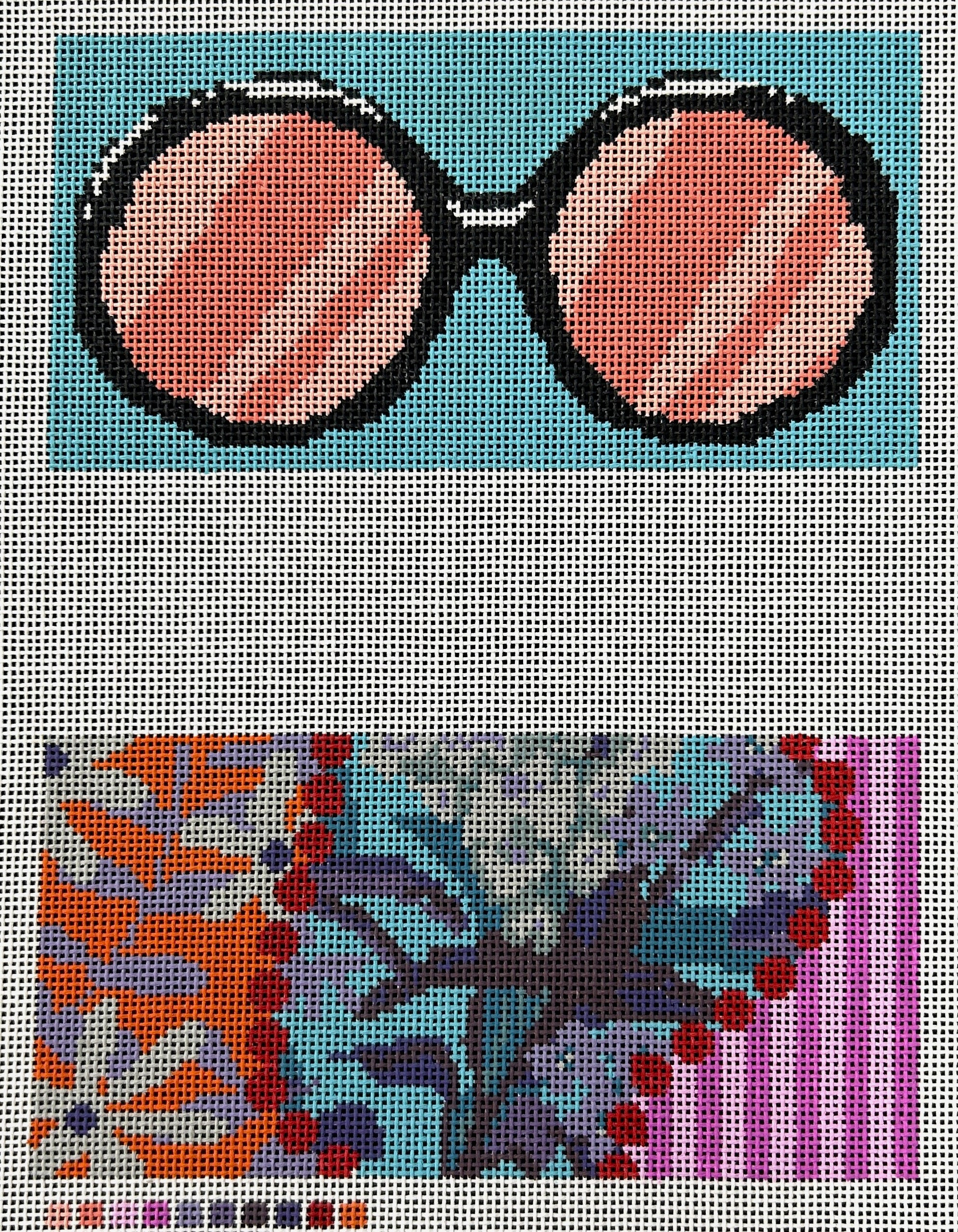 This hand painted needlepoint canvas by Rittenhouse Needlepoint features a two sided eyeglass case inspired by the oversized glasses of the late fashion icon.