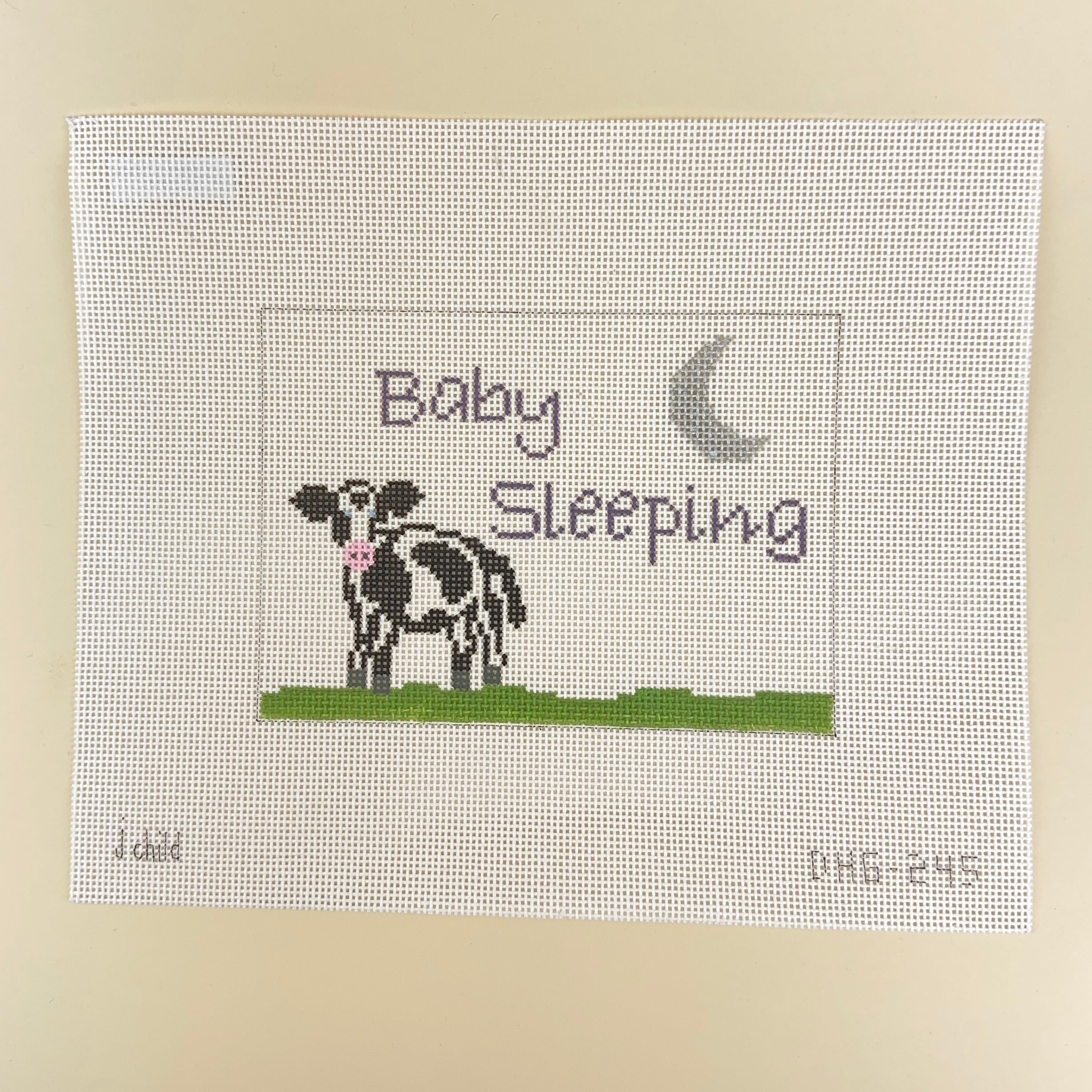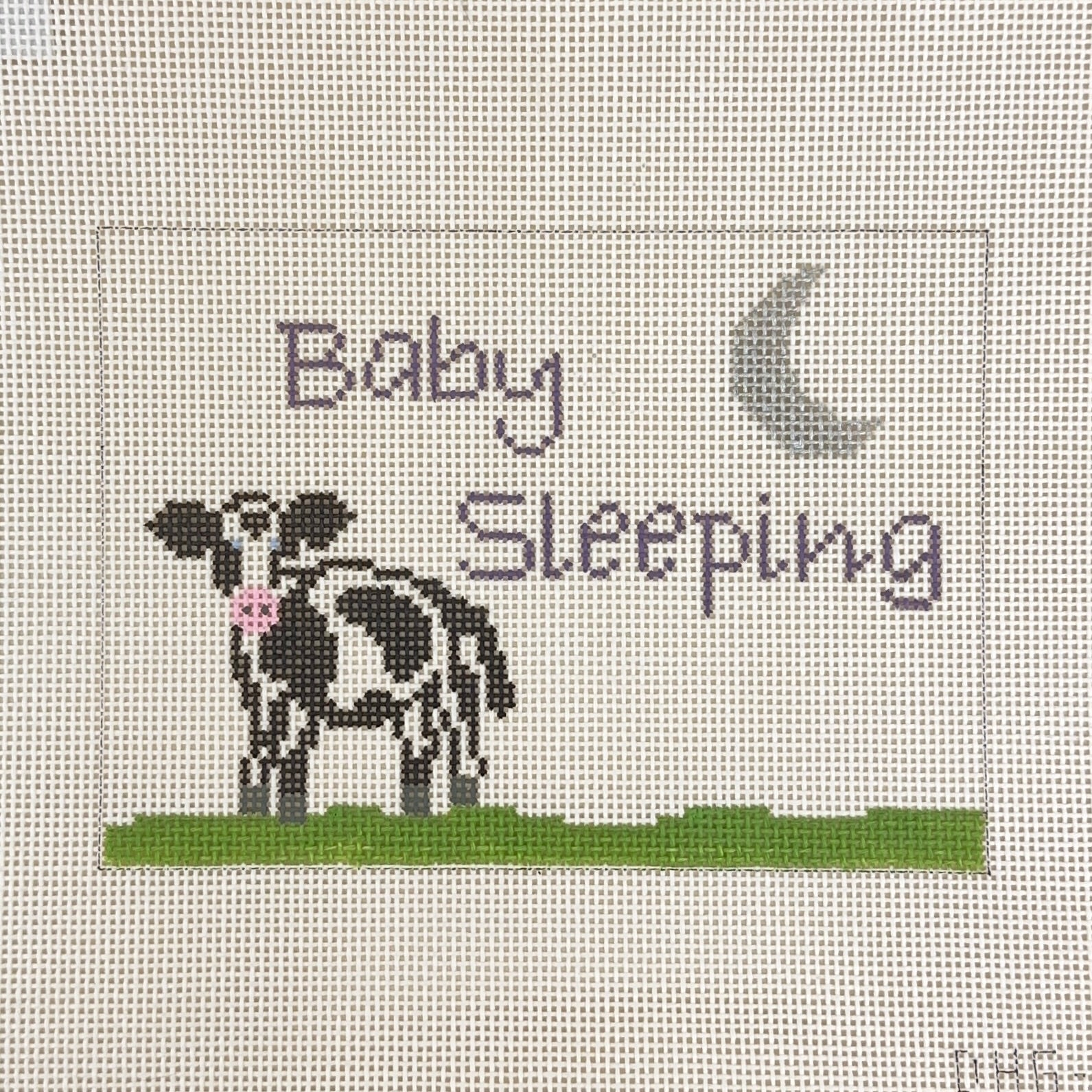 This hand painted needlepoint canvas from J. Child Designs features a sweet baby cow with "Baby Sleeping".