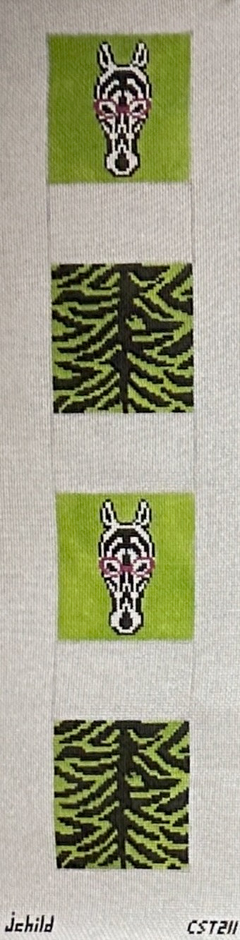 A beautiful hand painted needlepoint canvas from J. Child Designs featuring a set of 4 coasters, 2 with zebras and 2 with a lime green and black zebra pattern.