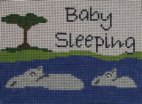 This hand painted baby sleeping sign needlepoint canvas by J Child features a mama and baby hippo swimming together.