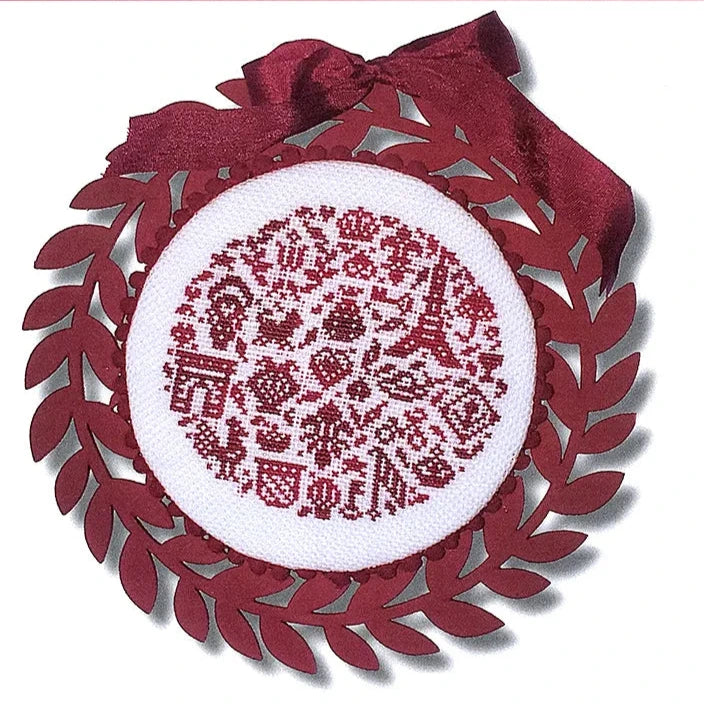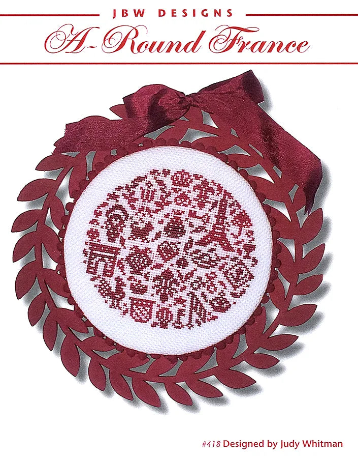This is a printed cross stitch pattern by JBW Designs. It features a design made up of several motifs with a French theme. The example as stitched uses Classic Colorworks cotton floss on 28 count Antique White Cashel linen.