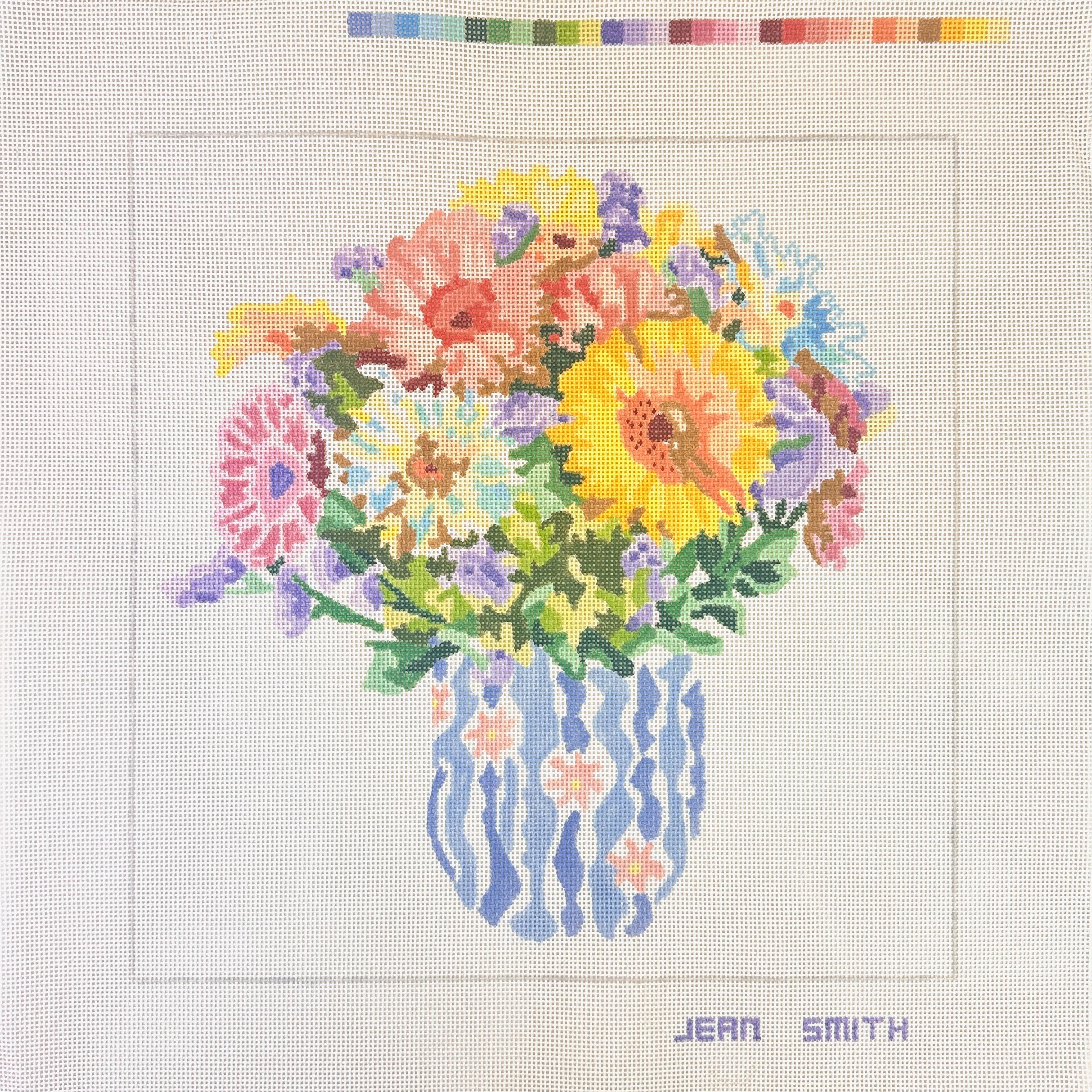 A hand painted needlepoint canvas from Jean Smith Designs. It features a bouquet of beautiful flowers.