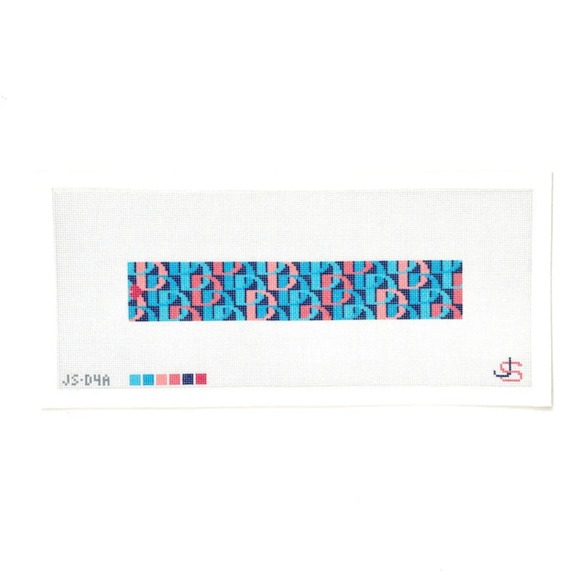 This is a hand painted needlepoint canvas by Jeni Sandberg Needlepoint. This canvas features a repeating D pattern in shades of turqouise and coral, and is intended to be finished as a holder for your key fob.
