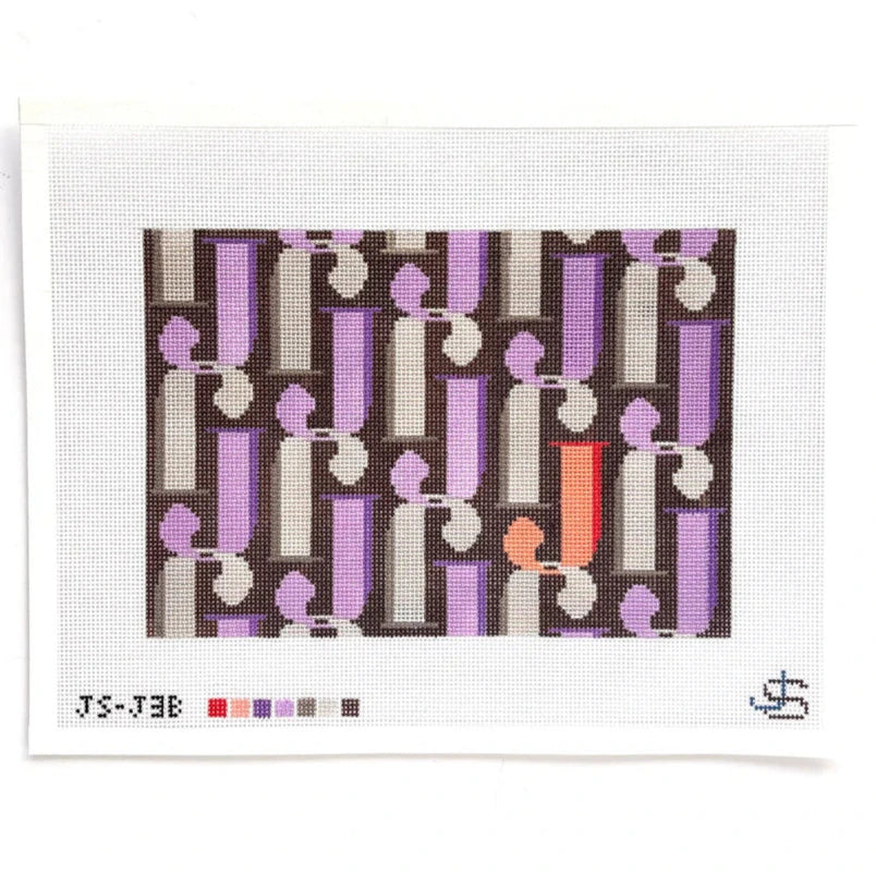This is a hand painted needlepoint canvas by Jeni Sandberg Needlepoint. This canvas features a repeating L pattern in shades of lavender and brown, and is intended to be finished as a small clutch.