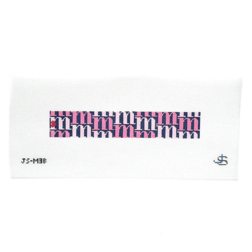 This is a hand painted needlepoint canvas by Jeni Sandberg Needlepoint. It features a repeating M pattern in shades of pink and blue, and is intended to be finished as a holder for your key fob.