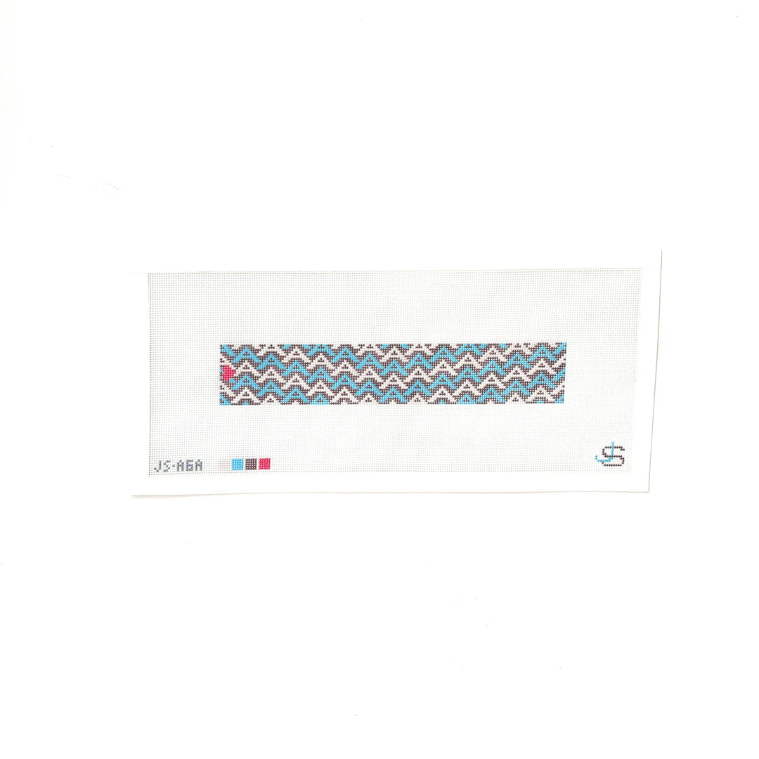 This hand painted needlepoint canvas by Jeni Sandberg features a pattern made out of the letter A. It is designed to be finished into a key fob, but would also make a great bookmark or bracelet. The design includes a tiny red heart at the end. It will likely be covered if finished into a key fob and becomes a secret love token.