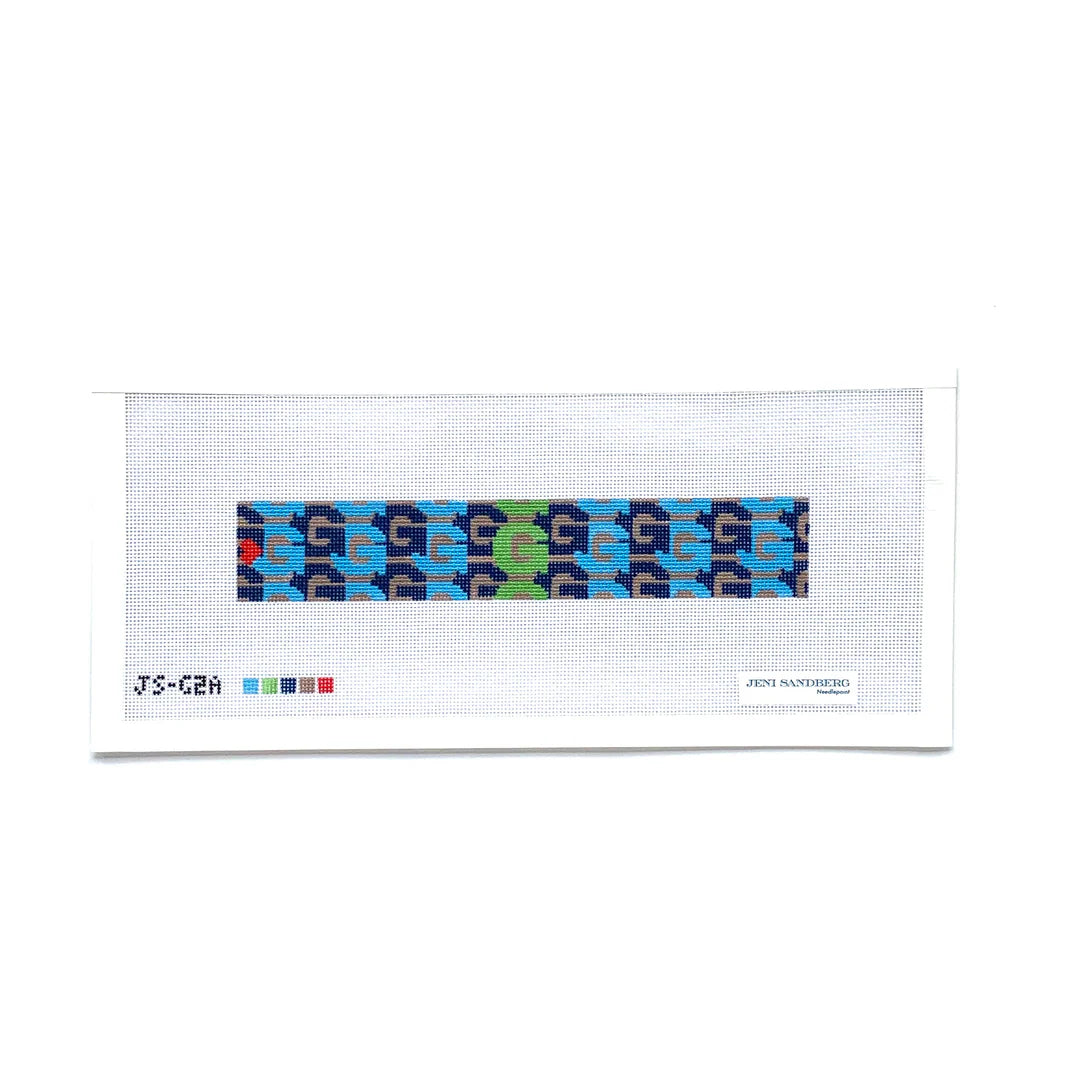 This hand painted needlepoint canvas by Jeni Sandberg features a pattern made out of the letter G. It is designed to be finished into a key fob, but would also make a great bookmark or bracelet. The design includes a tiny red heart at the end. It will likely be covered if finished into a key fob and becomes a secret love token.