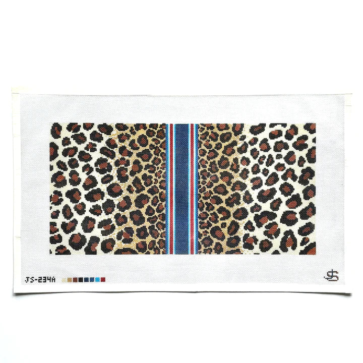 This hand painted needlepoint canvas from Jeni Sandberg Needlepoint features an all-over leopard pattern with a center stripe and can be finished as a tote bag or large pillow. Finished example shown for reference - finishing services and materials not included.