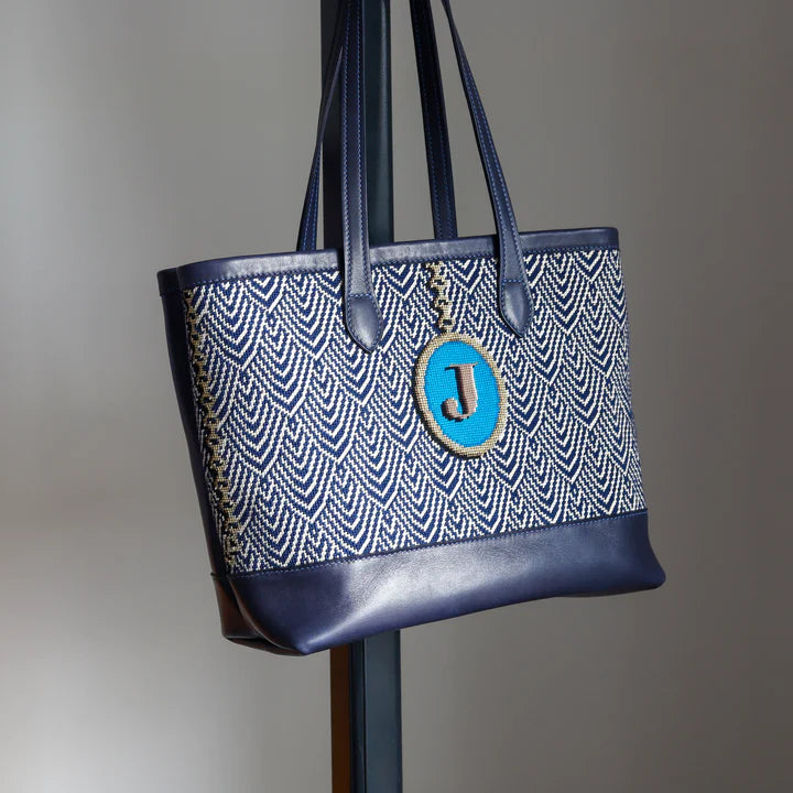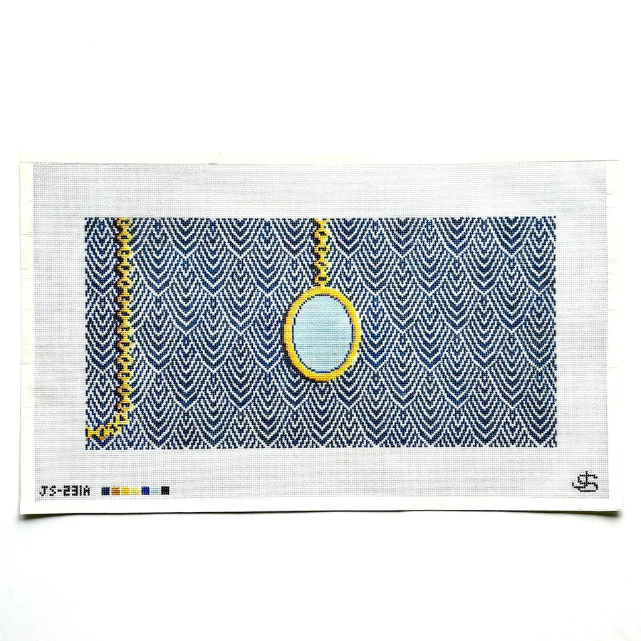 This hand painted needlepoint canvas from Jeni Sandberg Needlepoint features a gold pendant with space for your initial. The dark blue and white background design is based on a weaving pattern. Finished example shown for reference - finishing services and materials not included.