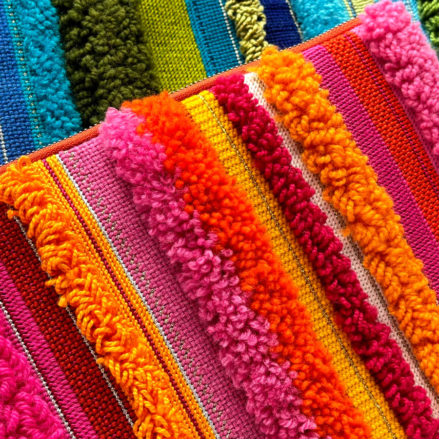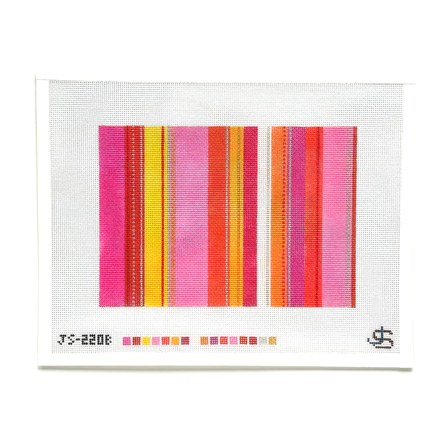 This hand painted needlepoint canvas from Jeni Sandberg Needlepoint was inspired by Moroccan handiras, chenille bedspreads, and mid-century textile designer Dorothy Liebes. This colorful striped pattern comes to life when tufted Turkey work and other decorative stitches are included in your stitching. See Jeni's site for stitch guides. You can also skip the turkey work and finish this as a tray! In many shades of the brightest pinks and oranges, with metallic touches. Finished example shown for reference - finishing services and materials not included.