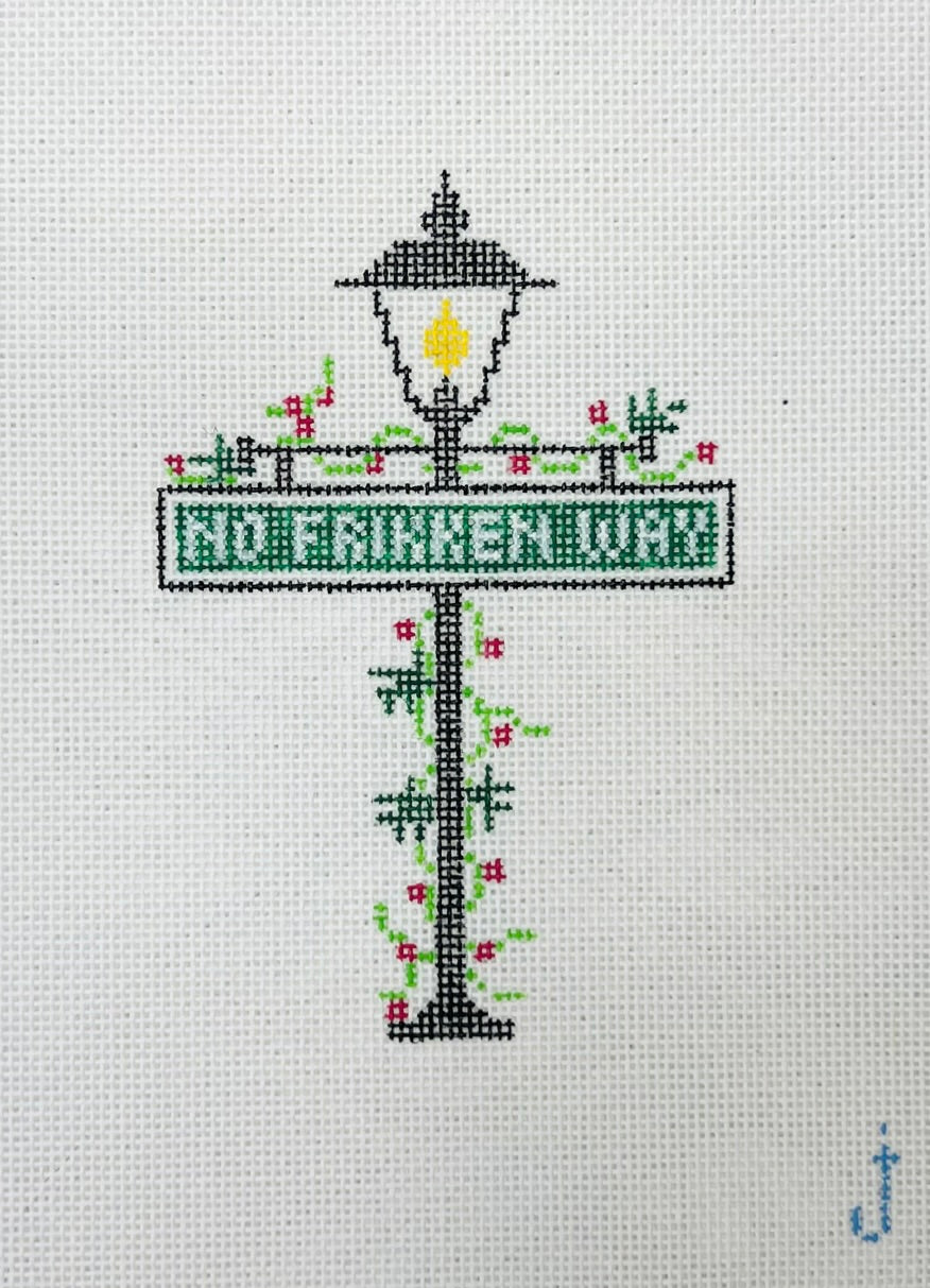 This hand painted needlepoint canvas from Jessica Tongel Designs features a cheeky lamppost hung with the sign "No Frikken Way".