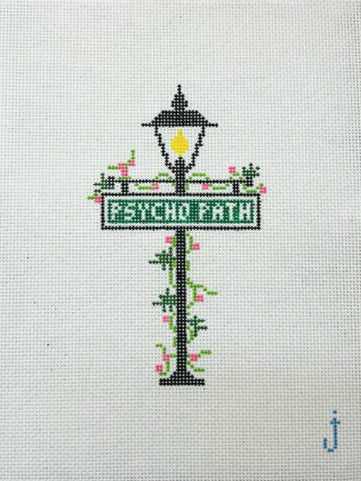 This hand painted needlepoint canvas from Jessica Tongel Designs features a cheeky lamppost hung with a sign for the "Psycho Path".