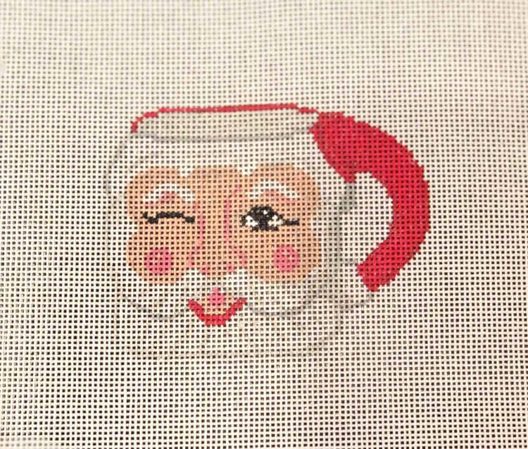 This hand painted needlepoint canvas from Jessica Tongel Designs features classic vintage winking Santa mug.