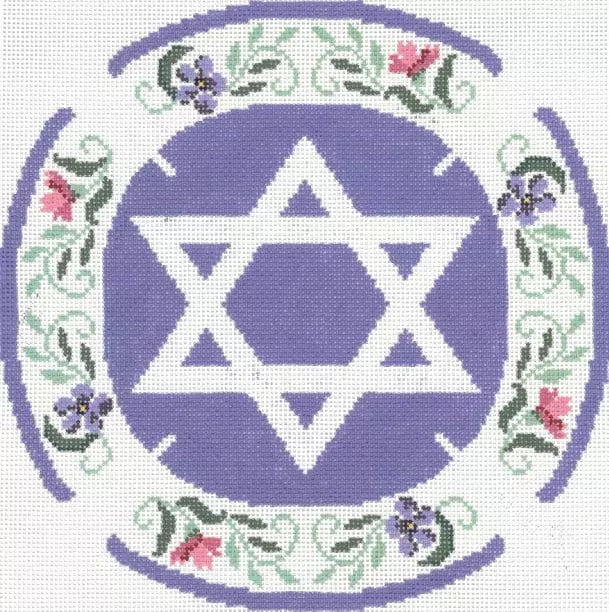 A beautiful hand painted needlepoint canvas from Judaic Designs by Tonya. This hand painted yarmulke or kippah needlepoint canvas features a lovely floral design in lavender and other soft shades around a central Star of David.
